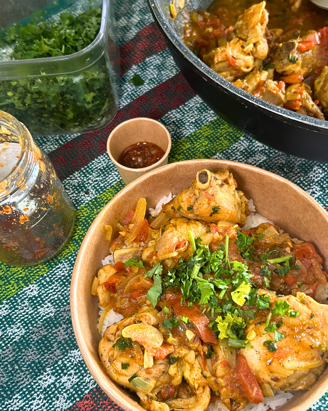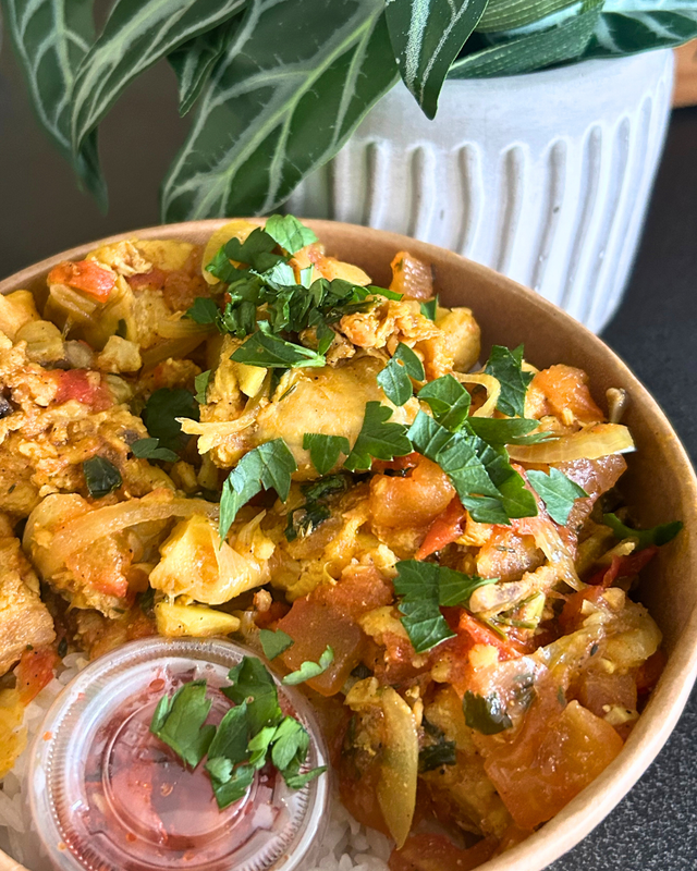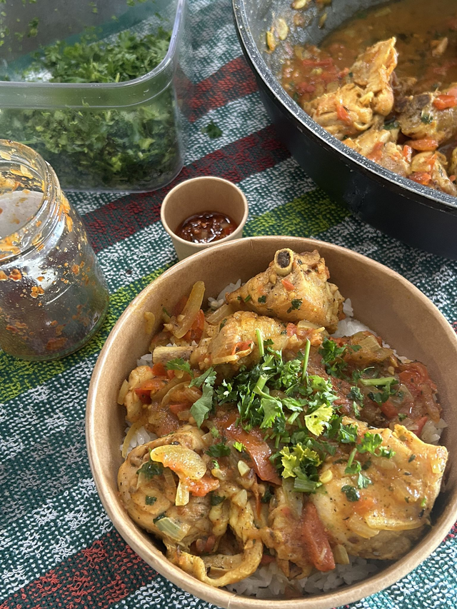 Carry Poulet + riz + grains +rougail piment